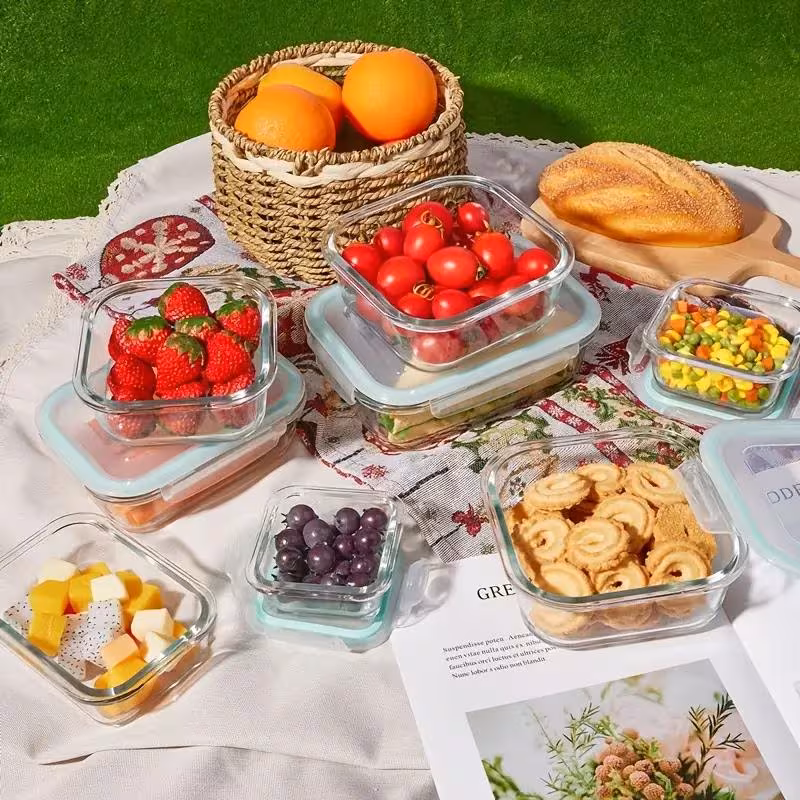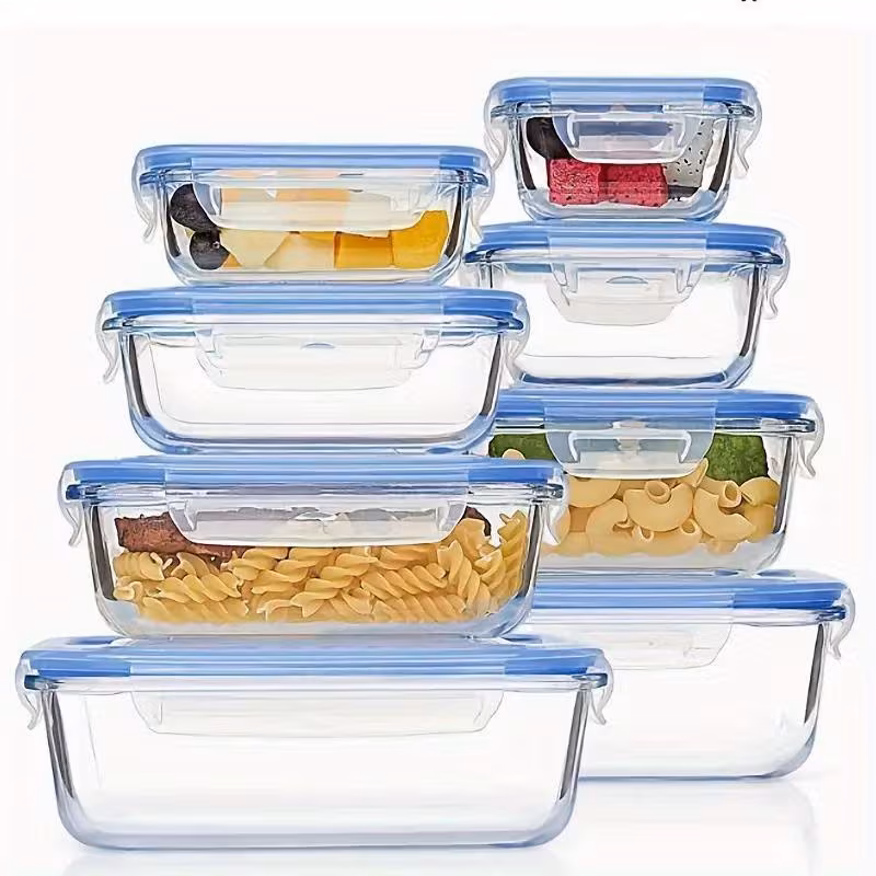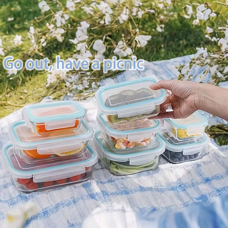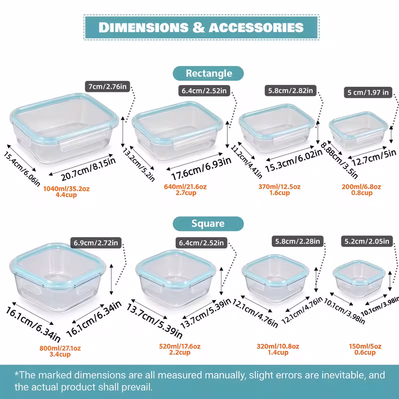 The set of 8 glass storage containers includes: (1040mL/35.1OZ) + (640mL/21.6OZ) + (370mL/12.5OZ) + (200mL/9.8OZ) + (800mL/27.1OZ) + (520mL/27.6OZ) + (320mL/10.8OZ) + (150mL/5OZ); these various sizes can meet all your storage needs. They are perfect for outdoor activities, picnics, barbecues, and leftovers. The food storage containers feature a stackable design, allowing them to be neatly arranged in the fridge or cupboard to save space. The transparent glass makes it easy to identify the contents, facilitating organization and storage. When not in use, they can be stacked together to conserve space. The containers are made of safe, durable glass, suitable for storing fruits, vegetables, salads, grains, meals, meats, and soups. *Note: There is a small chance that glass products may break during shipping, so please handle with care when unpacking, wear gloves, and do not allow individuals under 18 to open the box.
