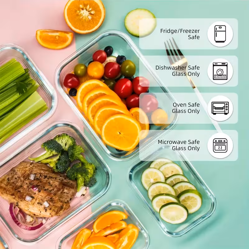 The glass meal prep containers are made from high-quality glass and can withstand temperatures from -4°F to 752°F (-20°C to 400°C). They are safe to use in the oven, microwave, dishwasher, and refrigerator. (Note: Do not place the lids in the microwave or oven.)