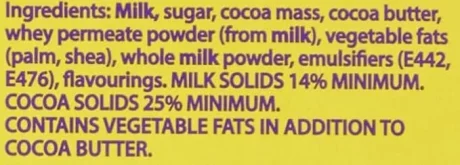 MILK, Sugar, Glucose Syrup, Cocoa Butter, Cocoa Mass, Vegetable Fats (Palm, Shea), Whey Powder (from MILK), Glucose-Fructose Syrup, Skimmed MILK Powder, Whole MILK Powder, Rice Flour, Emulsifiers (SOYA Lecithins, E442, E476, E471), Whey Permeate Powder (from MILK), MILK Fat, Stabiliser (Sorbitol), Humectant (Glycerol), Invert Sugar Syrup, Fat-Reduced Cocoa Powder, Salt, Flavourings (contain MILK), Molasses, BARLEY Malt Extract, Dried EGG Whites, Acidity Regulator (Sodium Carbonates), Colours (Carotenes, Paprika Extract, E150d), Milk Chocolate: Milk Solids 20 % minimum, Milk Chocolate: Milk Solids 14 % minimum, Contains Vegetable Fats in addition to Cocoa Butter