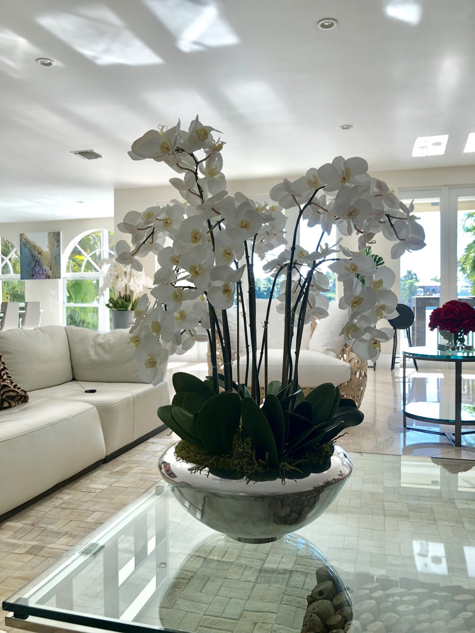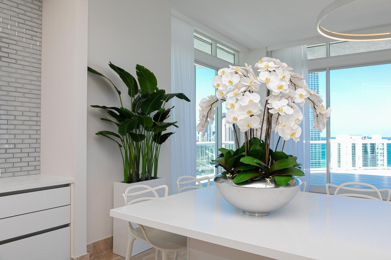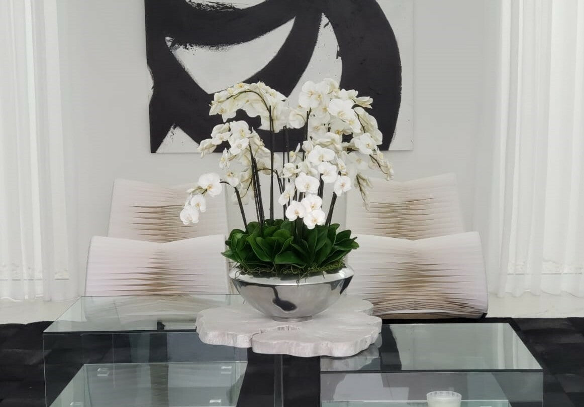 Graceful and exotic. the white orchid has symbolized integrity. nobility. and luxury for centuries. Our enduring. snow white phalaenopsis arrangement captures the artistry and spirit of natural orchids. It’s prized for its profusion of perfect blooms. Vertical bamboo stakes. broad green leaves. and a genuine moss base add to the realism of this arrangement.Often called the moth orchid. the phalaenopsis is a favorite among our designers for its dense leaves. elegantly arching sprays and lovely white blooms. Our remarkably lifelike arrangement is staked into a moss-covered silver avenue bowl for a timeless. authentic look that will endure for years to come. This arrangement is just the right size and is versatile enough to use as a coffee table centerpiece. a dining room or console table. It has a luscious tropical feel that will add vibrancy and elegance to any room.