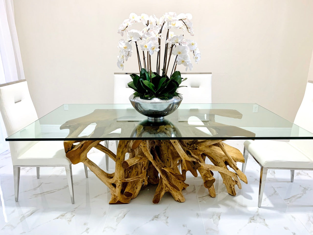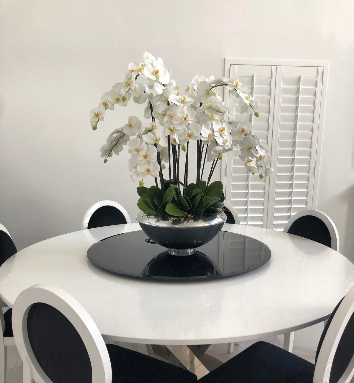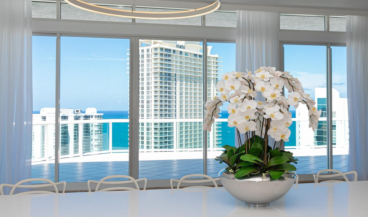 Graceful and exotic. the white orchid has symbolized integrity. nobility. and luxury for centuries. Our enduring. snow white phalaenopsis arrangement captures the artistry and spirit of natural orchids. It’s prized for its profusion of perfect blooms. Vertical bamboo stakes. broad green leaves. and a genuine moss base add to the realism of this arrangement.Often called the moth orchid. the phalaenopsis is a favorite among our designers for its dense leaves. elegantly arching sprays and lovely white blooms. Our remarkably lifelike arrangement is staked into a moss-covered silver avenue bowl for a timeless. authentic look that will endure for years to come. This arrangement is just the right size and is versatile enough to use as a coffee table centerpiece. a dining room or console table. It has a luscious tropical feel that will add vibrancy and elegance to any room.