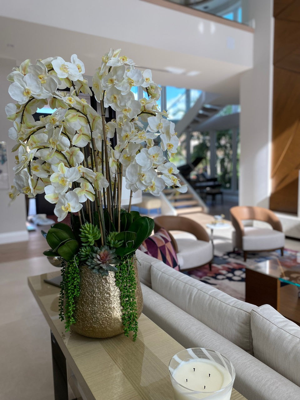 Often called the moth orchid. the Phalaenopsisis a favorite among our designers for its dense leaves. elegantly arching sprays. and lovely white blooms. Our remarkably lifelike arrangement is staked into a moss-covered Delany textured gold pot.Exceptional craftsmanship is presented at spectacular scale in this gorgeous white Phalaenopsis arrangement. showcased the Delany Pot which is cast from aluminum. then polished and electro-plated for a textured gold finish and simple silhouette. It’s designed for drama and destined to get attention: Display it on your dining room tabletop. or let this Phalaenopsis orchid make a great first impression in the foyer.