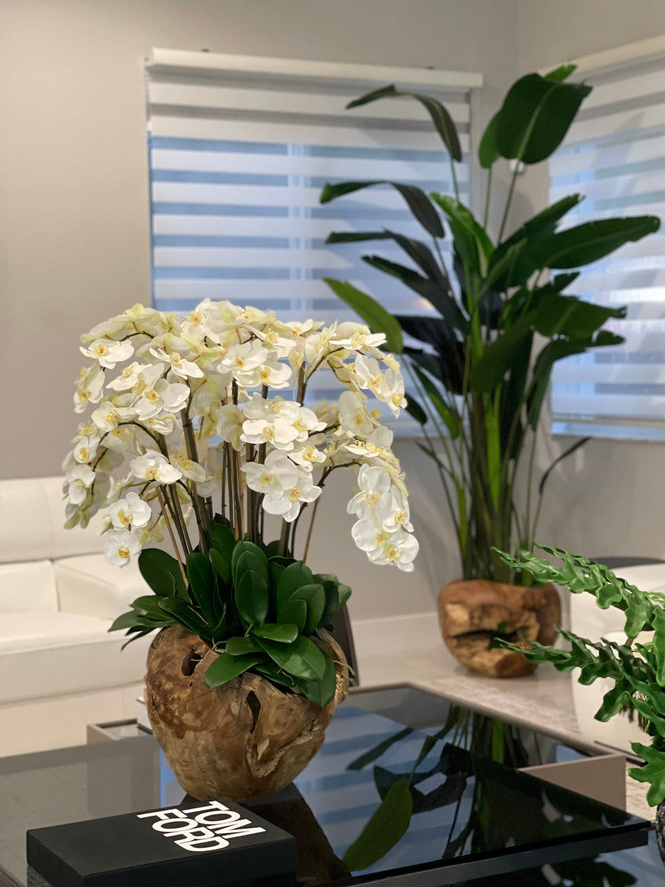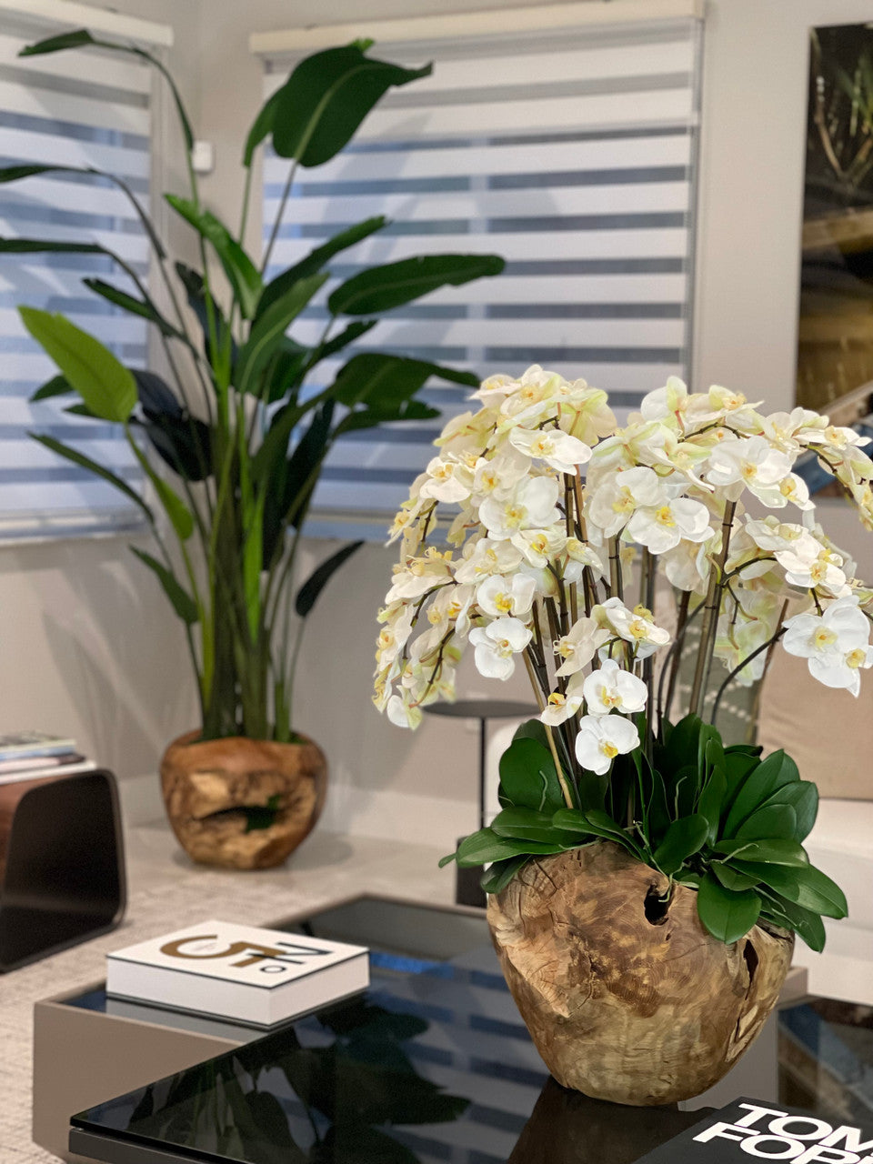 The timeless beauty and elegance of white orchids. paired with a unique one of kind hand made teak bowl from Indonesia. Each bowl has natural imperfections that add to the uniqueness and beauty of the arrangement. Give your space an impressive finishing touch with this Real Touch Phalaenopsisorchid arrangement. Presented in an elegant teak bowl. these natural-looking orchids provide an opportunity to enjoy the presence of fresh orchids all year-round without the hassle of watering.