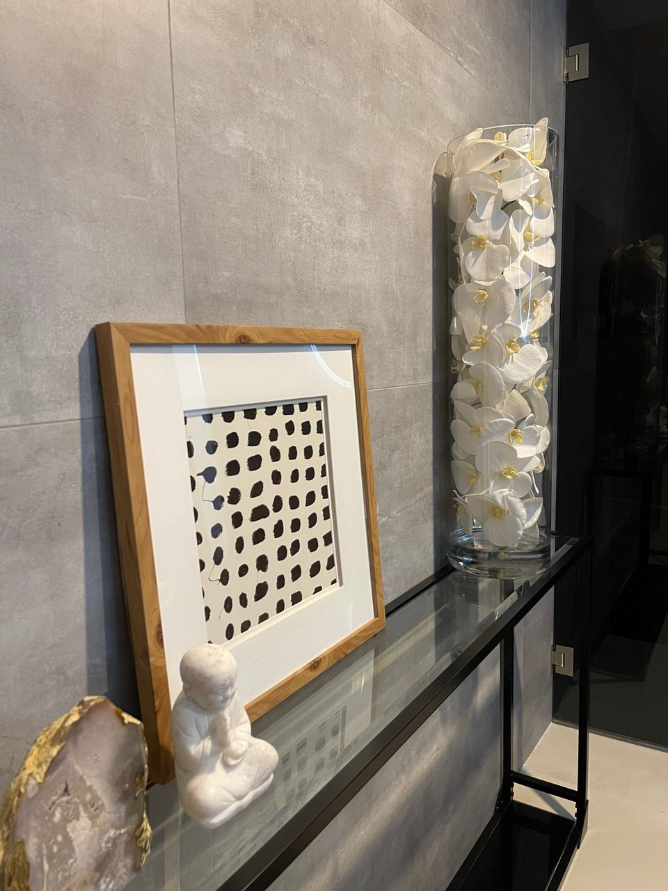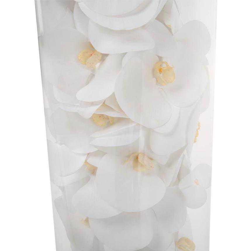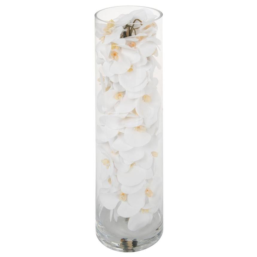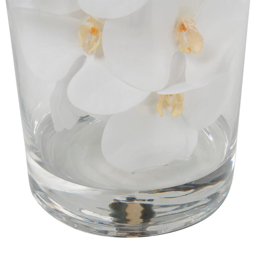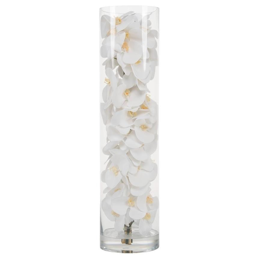 White phalaenopsis orchids anchored in Illusion water- completely contained inside a glass cylinder for a modern and sophisticated look. Grouped in three different sizes (40. 32. and 28). paired or elegantly standing alone. the simplicity of this vase makes it perfect for any space and decor style.These white phalaenopsis orchids in cylinder vase are also great for any event. These vases are very versatile and can be used for any occasion. whether you are in need for an attractive centerpiece or a stunning and sophisticated home glass decor.Hand-blown crystal clear glass not machine made. Crafted with thick glass and a stable bottom for the perfect table centerpiece.