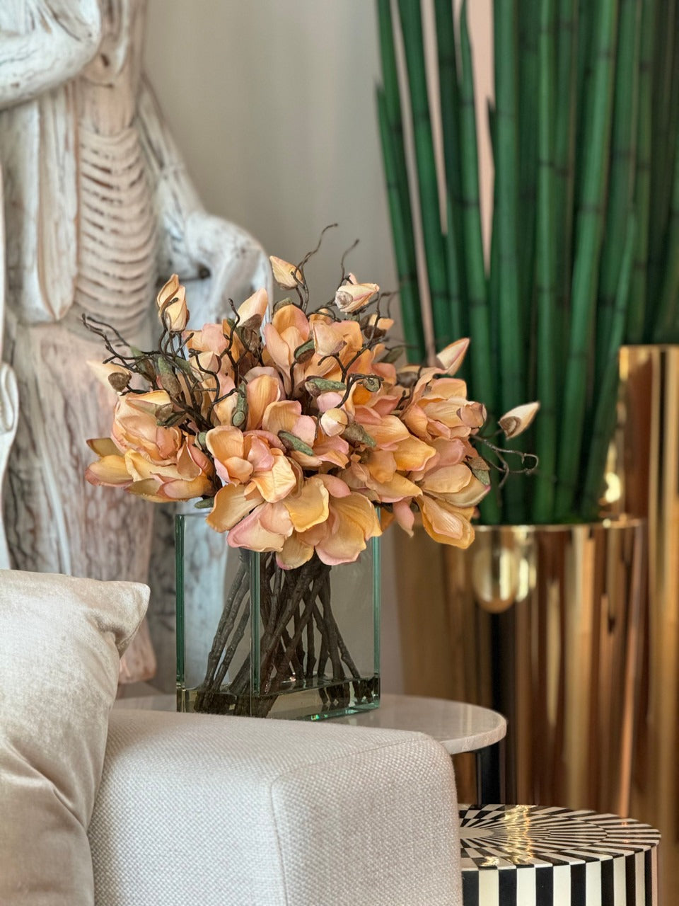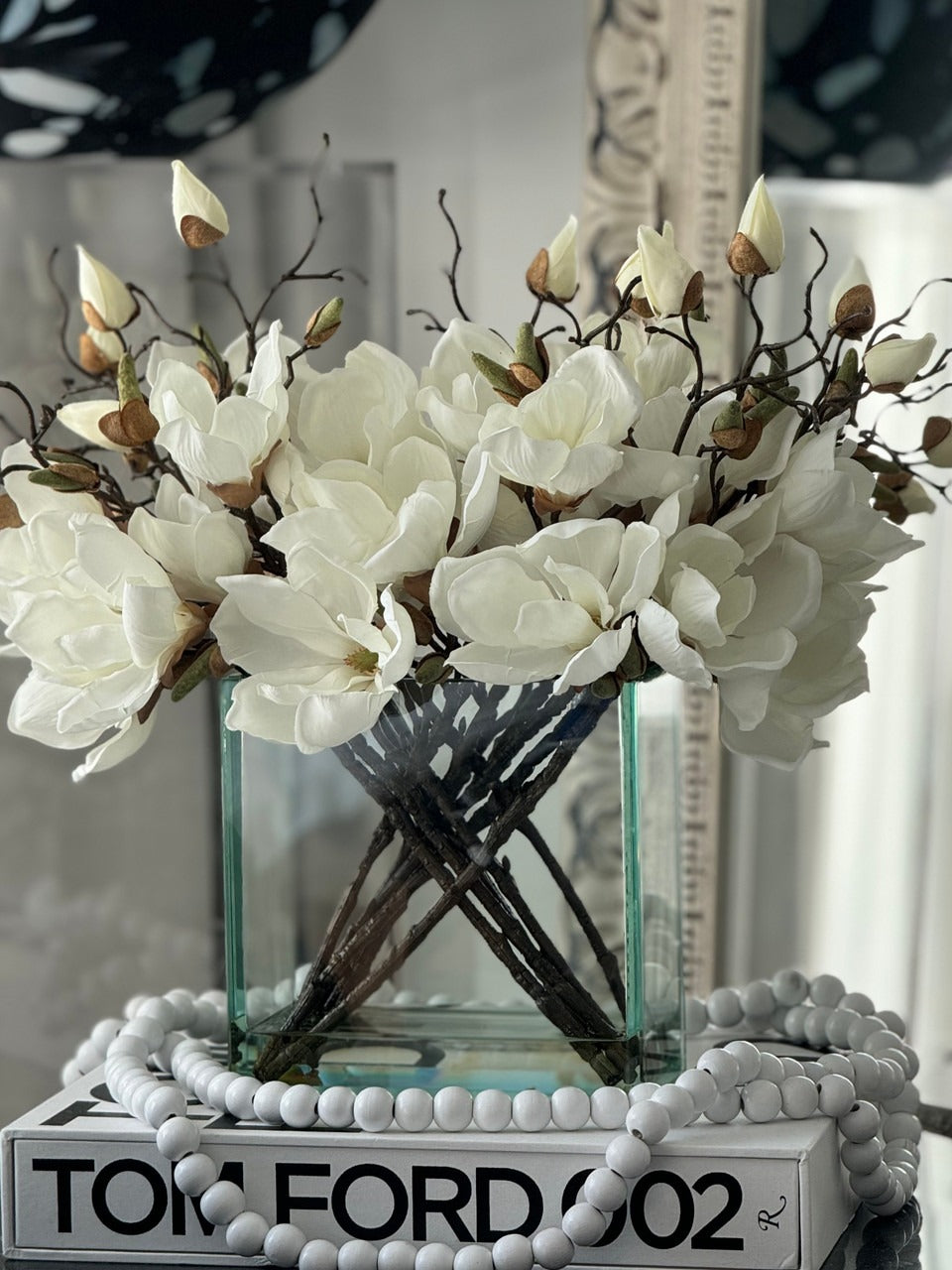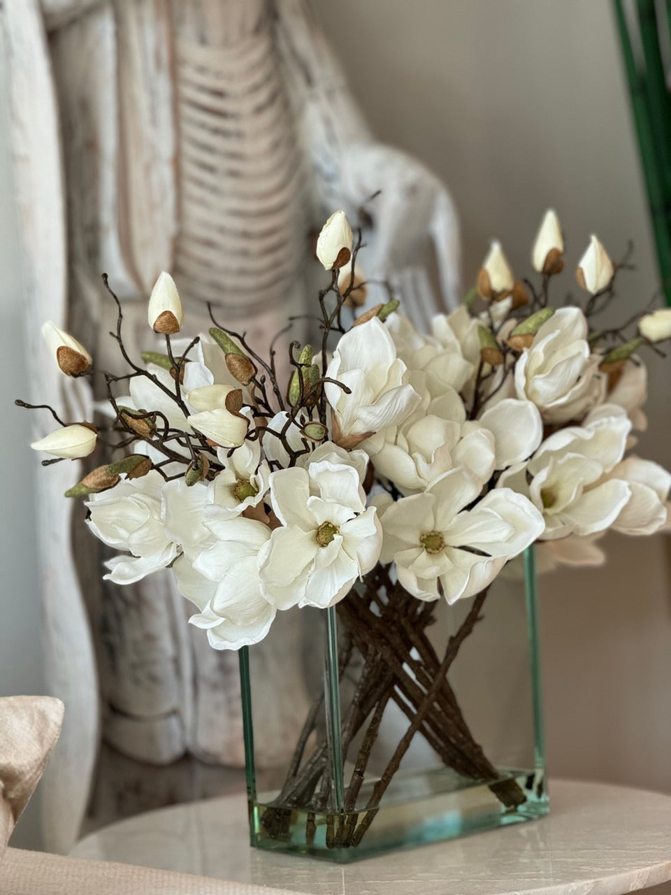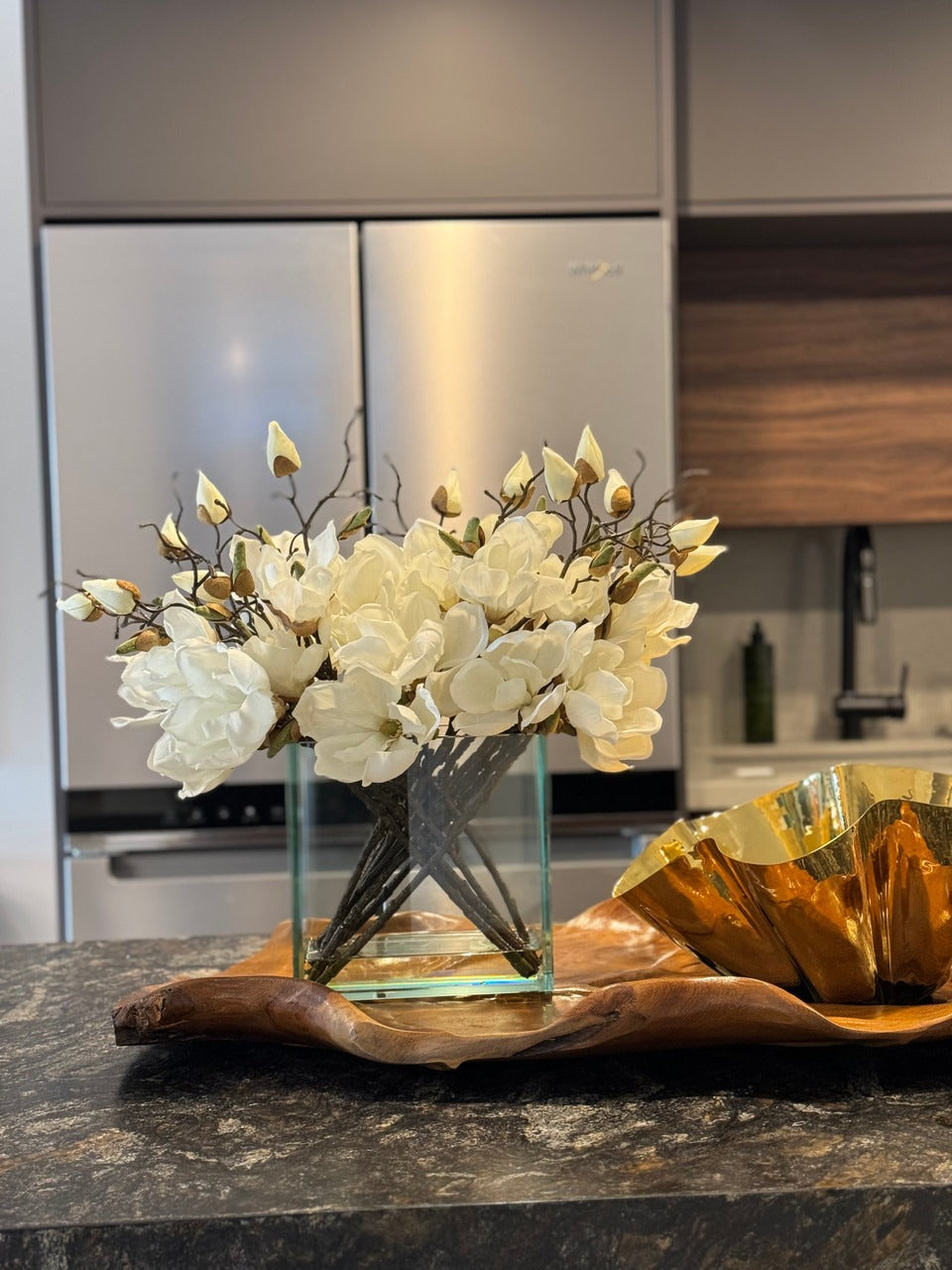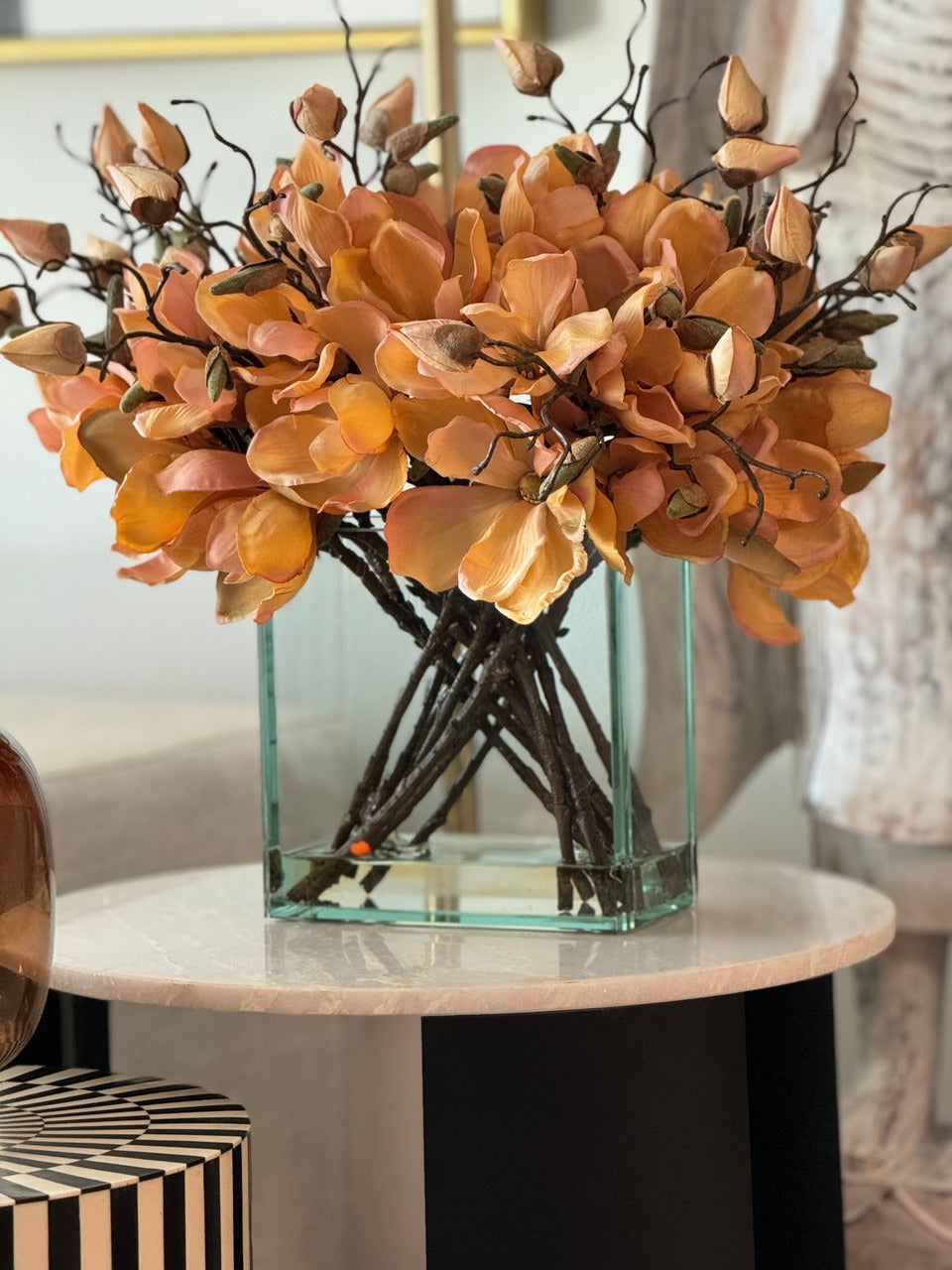 Square Casa Moderna glass planter with multiple stems of peach OR white magnolia blossoms. foliage and sand blasted grape wood anchored in our illusion water. Enjoy beautiful. lifelike magnolia tree branches that won’t fade after spring awakens. Displayed here in a stylish clear glass planter. magnolia flowers are cheerful and elegant in any season. Each hand-placed blossom and leaf is crafted with vivid color and exceptional detail. a tribute to Mother Nature’s artistry. Showcase this lovely faux tree on your dining table or living room tabletop.