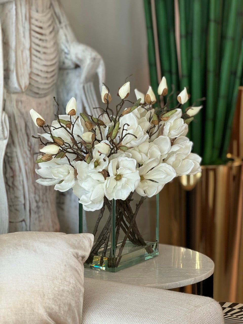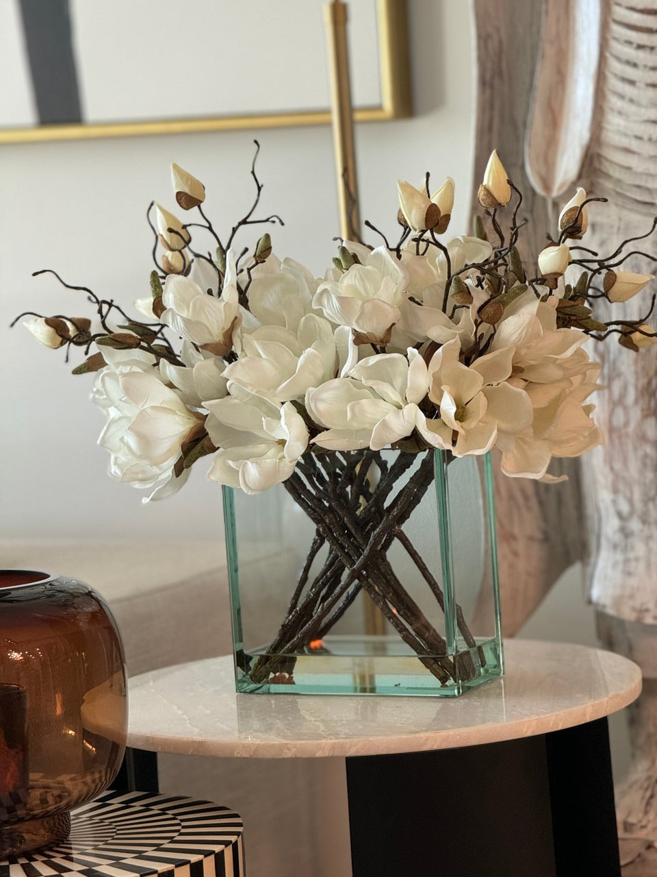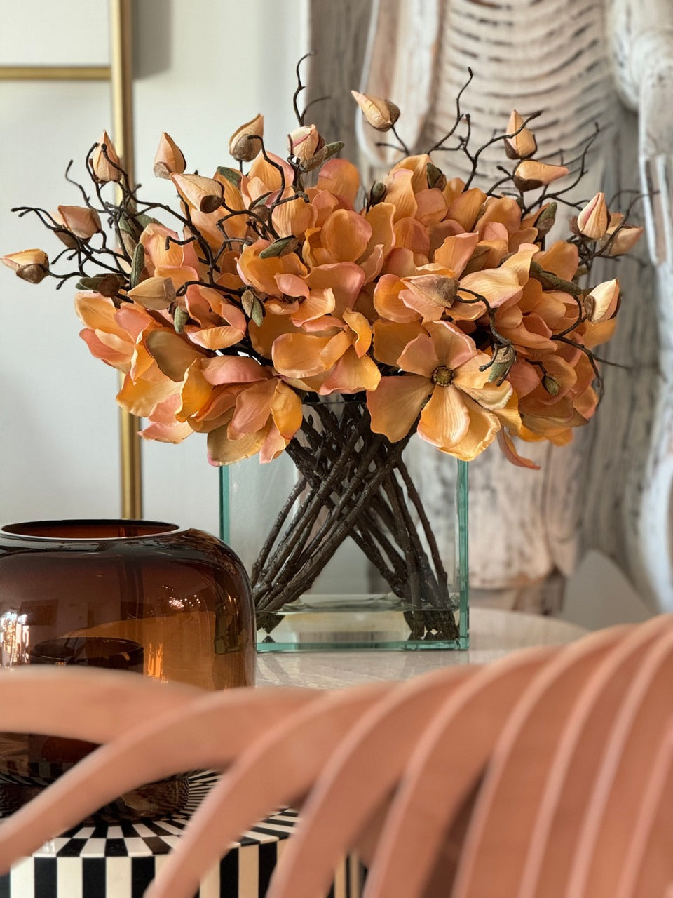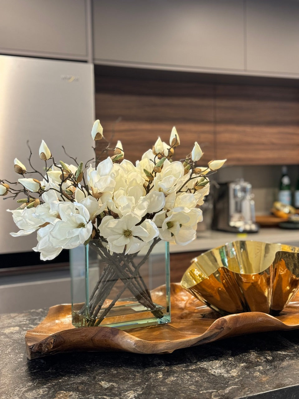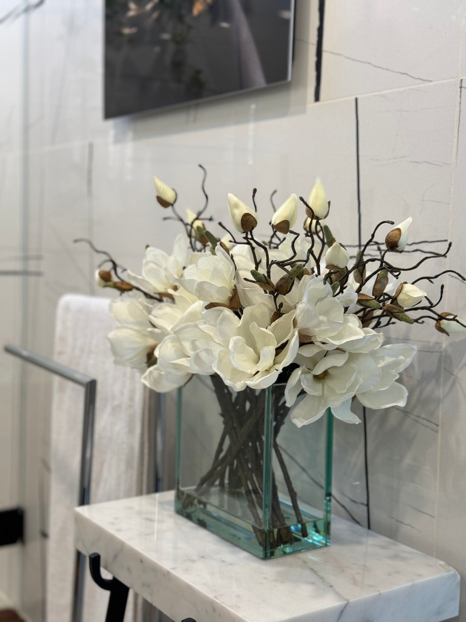 Square Casa Moderna glass planter with multiple stems of peach OR white magnolia blossoms. foliage and sand blasted grape wood anchored in our illusion water. Enjoy beautiful. lifelike magnolia tree branches that won’t fade after spring awakens. Displayed here in a stylish clear glass planter. magnolia flowers are cheerful and elegant in any season. Each hand-placed blossom and leaf is crafted with vivid color and exceptional detail. a tribute to Mother Nature’s artistry. Showcase this lovely faux tree on your dining table or living room tabletop.