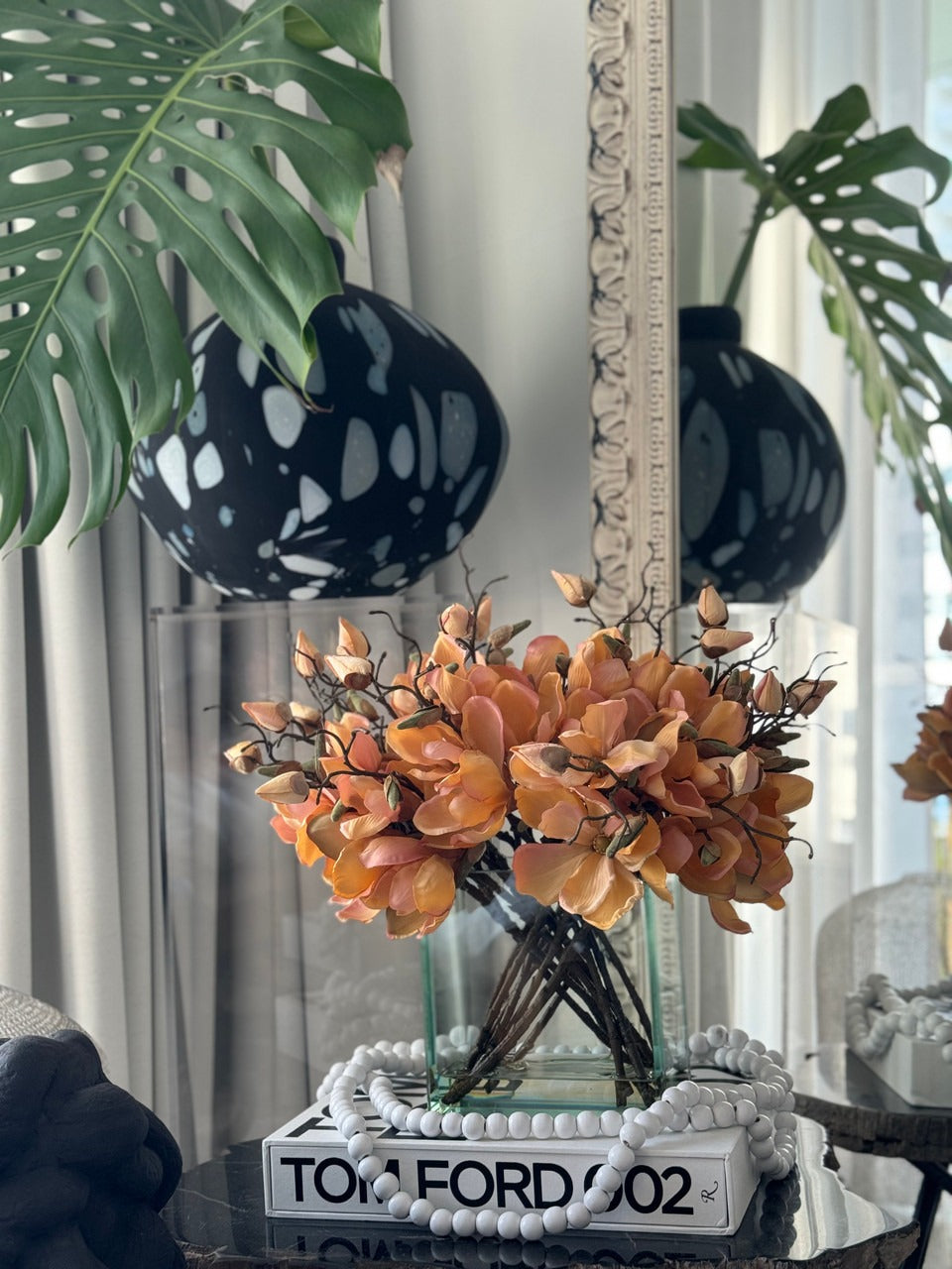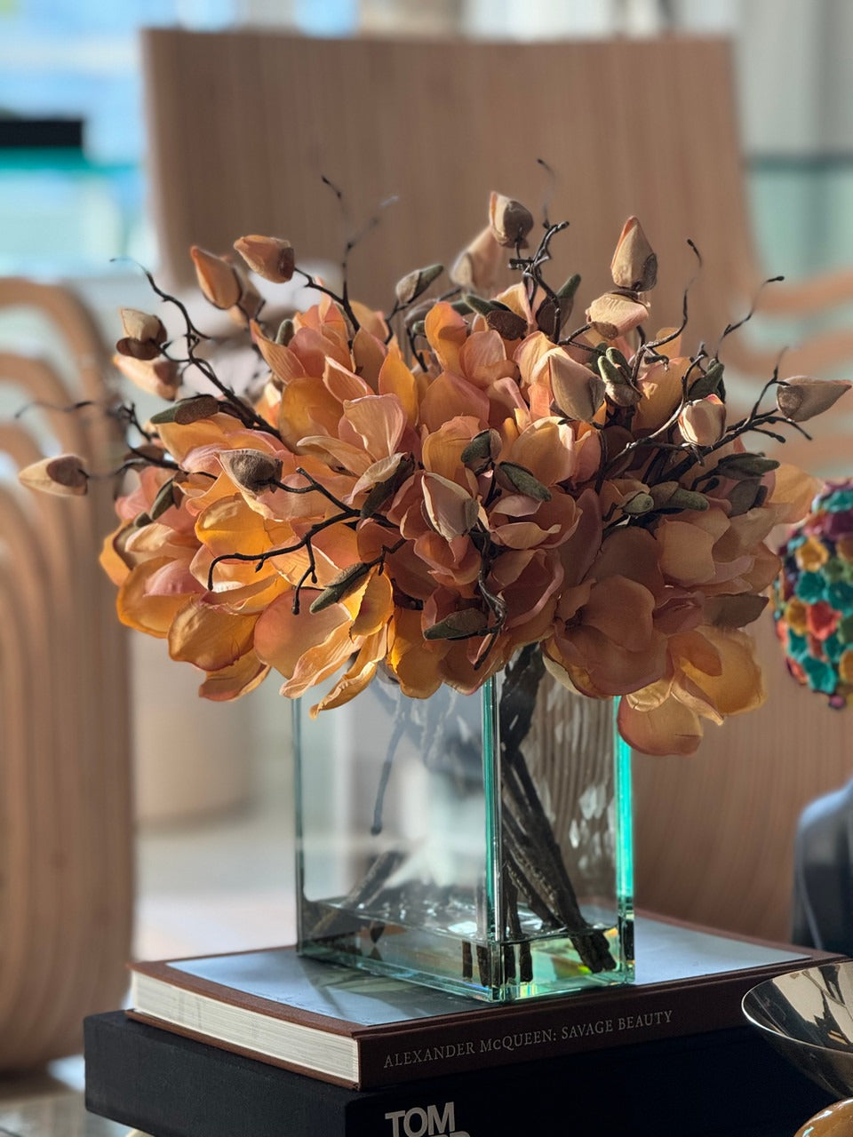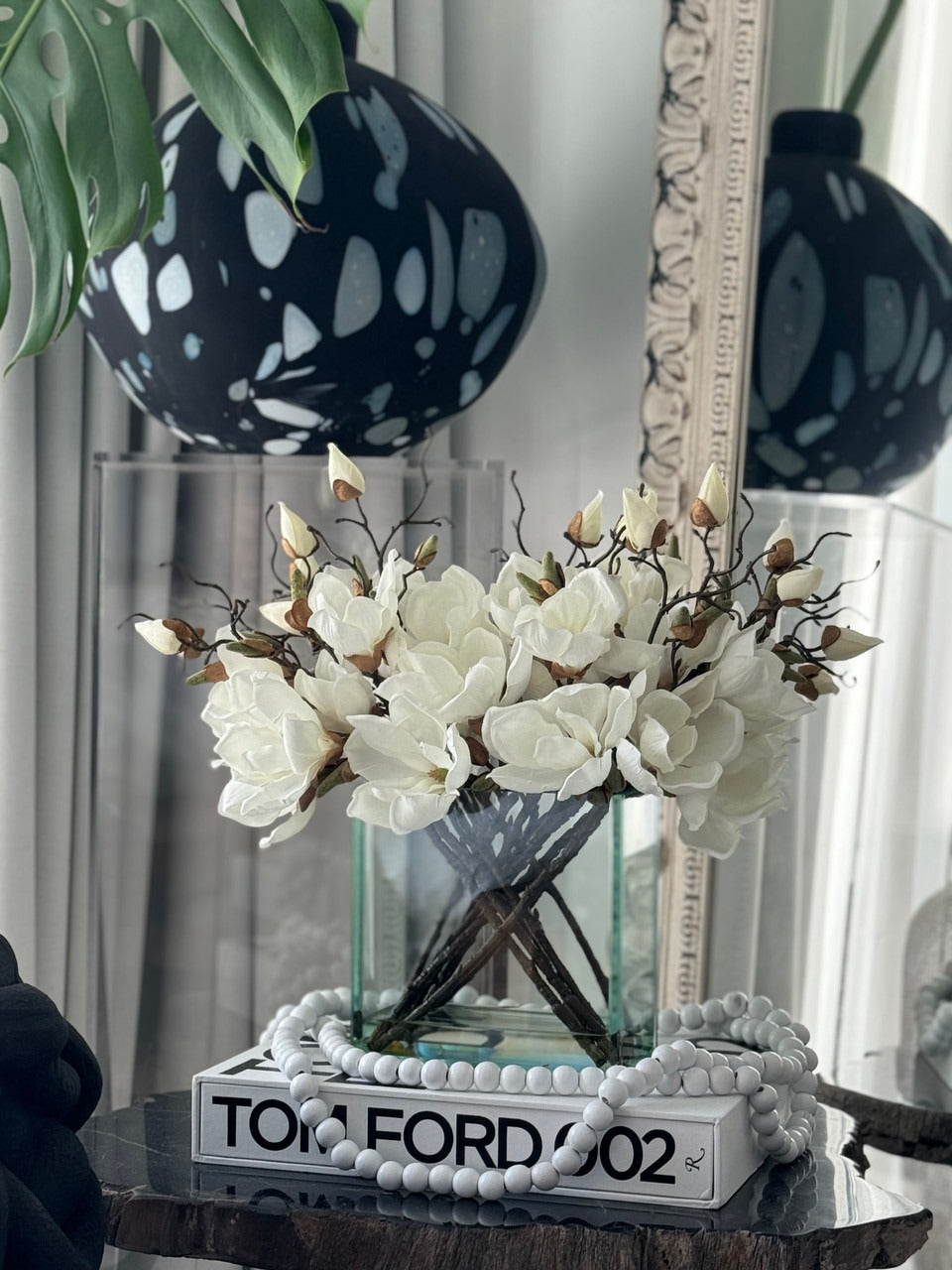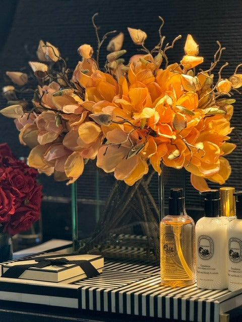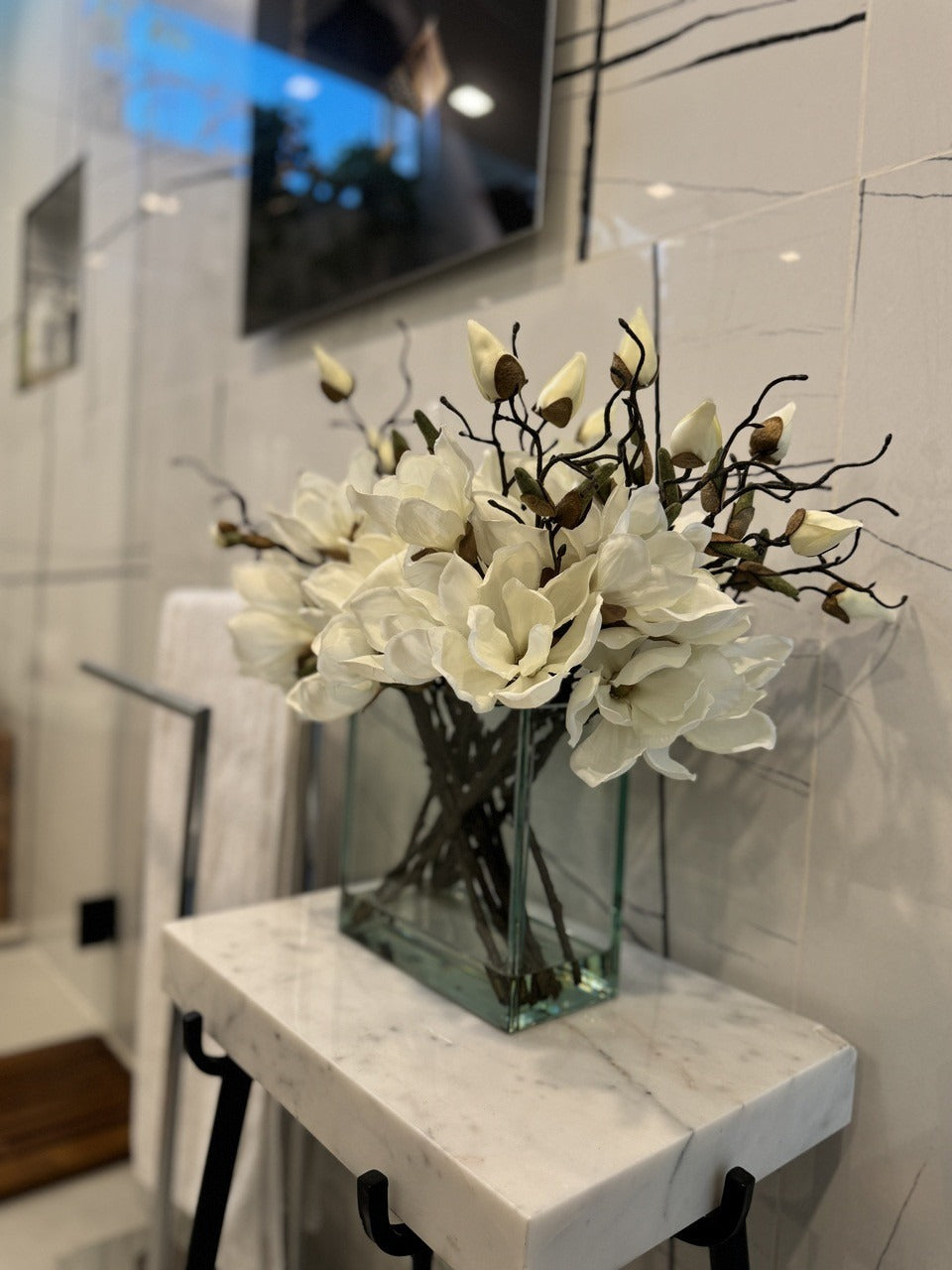 Square Casa Moderna glass planter with multiple stems of peach OR white magnolia blossoms. foliage and sand blasted grape wood anchored in our illusion water. Enjoy beautiful. lifelike magnolia tree branches that won’t fade after spring awakens. Displayed here in a stylish clear glass planter. magnolia flowers are cheerful and elegant in any season. Each hand-placed blossom and leaf is crafted with vivid color and exceptional detail. a tribute to Mother Nature’s artistry. Showcase this lovely faux tree on your dining table or living room tabletop.