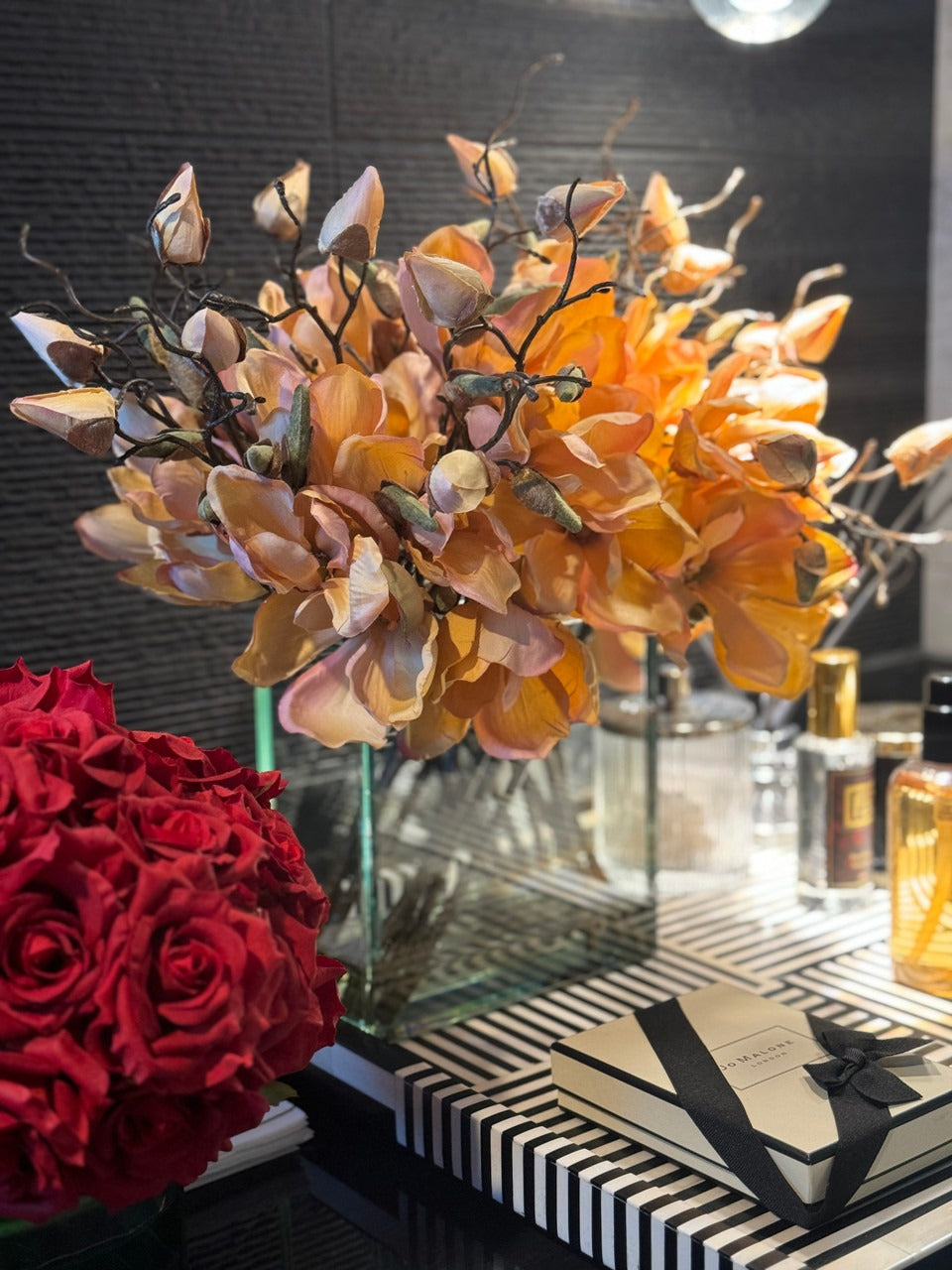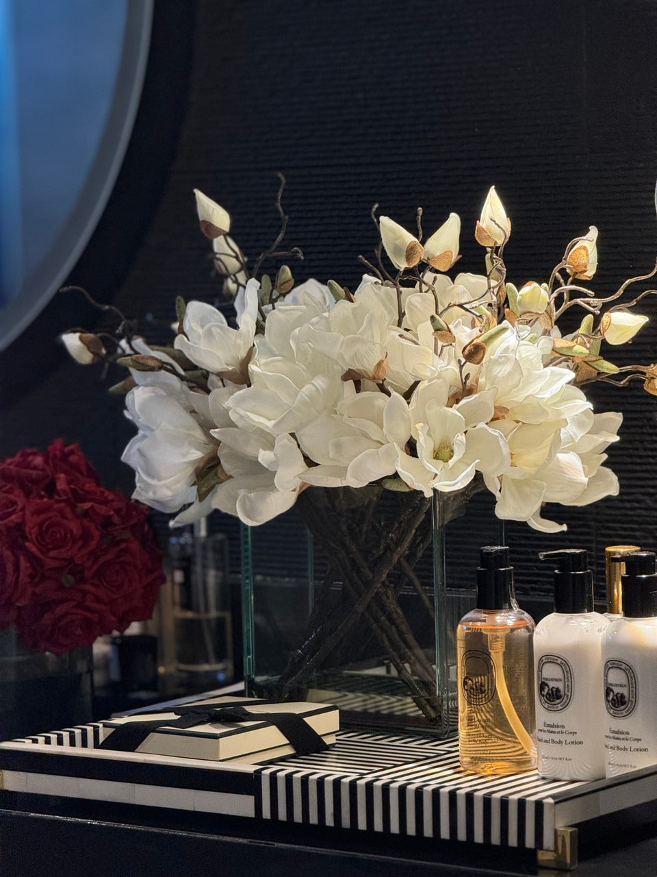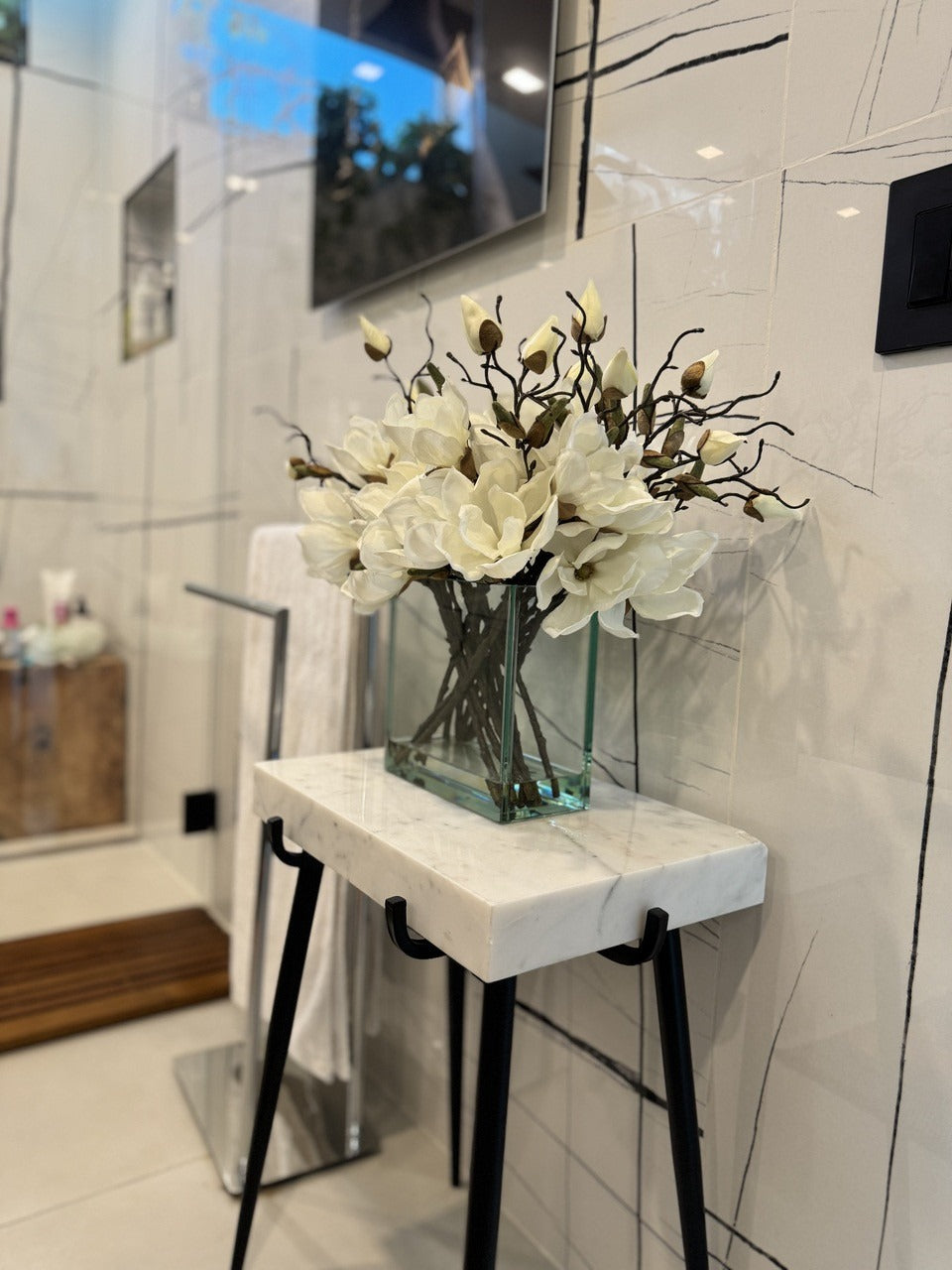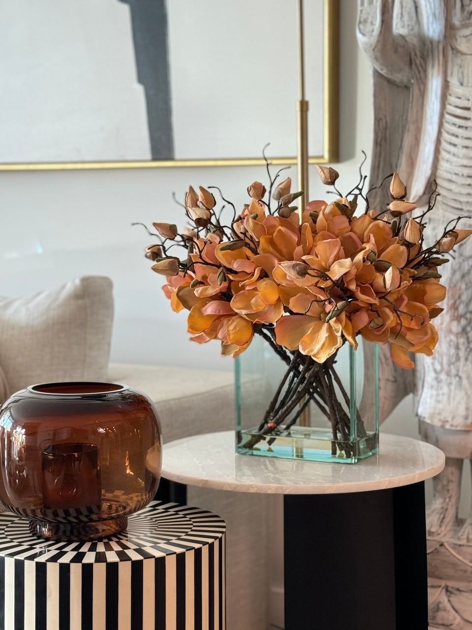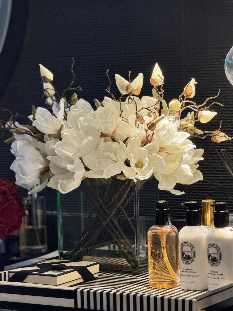 Square Casa Moderna glass planter with multiple stems of peach OR white magnolia blossoms. foliage and sand blasted grape wood anchored in our illusion water. Enjoy beautiful. lifelike magnolia tree branches that won’t fade after spring awakens. Displayed here in a stylish clear glass planter. magnolia flowers are cheerful and elegant in any season. Each hand-placed blossom and leaf is crafted with vivid color and exceptional detail. a tribute to Mother Nature’s artistry. Showcase this lovely faux tree on your dining table or living room tabletop.